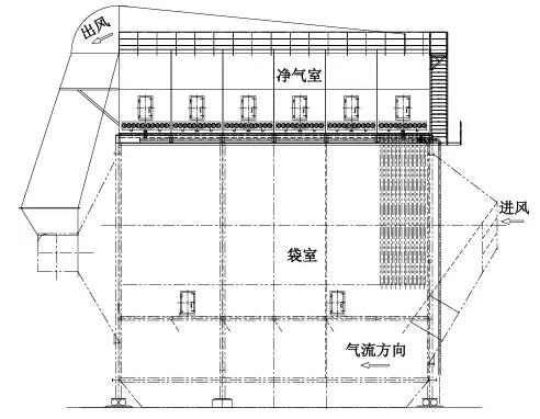 根據(jù)參數(shù)要求,窯尾除塵器電改袋時,原有電除塵器空間緊湊,水平截面較小,且寬度也較窄。風(fēng)量提高后,若按照常規(guī)的袋除塵器改造方式,需在設(shè)備殼體內(nèi)部設(shè)置出風(fēng)風(fēng)道,這樣要使改造后的袋除塵器滿足合理的過濾參數(shù),就會使濾袋間距很小,出風(fēng)風(fēng)道也較窄,這給整個收塵系統(tǒng)的穩(wěn)定低阻工作帶來很多不穩(wěn)定因素。