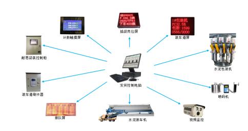 耐思袋裝水泥智能發(fā)貨控制系統(tǒng)由上位機(jī)中控系統(tǒng)、包裝機(jī)、裝車機(jī)、噴碼機(jī)、計(jì)數(shù)系統(tǒng)、自動(dòng)擋包裝置、自動(dòng)扳道裝置、PLC控制系統(tǒng)、裝車道刷卡終端、LED指示系統(tǒng)、聲光報(bào)警系統(tǒng)、視頻監(jiān)控系統(tǒng)、數(shù)據(jù)傳輸系統(tǒng)組成。