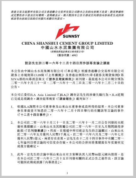 山水水泥1月13日公布,已委任JLA Asia Limited調(diào)查宓敬田的涉嫌失職行為,JLA近期已完成調(diào)查。根據(jù)JLA詢問公司董事會(huì)及山東山水董事會(huì)成員所得的結(jié)果,公司已通過董事會(huì)決議授權(quán)及指示公司的全資附屬公司China Pioneer Cement (Hong Kong) Company Limited,以其作為山東山水的唯一股東通過決議,自2017年1月12日起即時(shí)免除宓敬田在山東山水及其所有附屬公司的所有職務(wù)、權(quán)力及職責(zé),包括其山東山水的董事職務(wù)及副董事長職務(wù),以及免除宓敬田與公司、附屬公司及其關(guān)聯(lián)公司的所有雇傭關(guān)系。