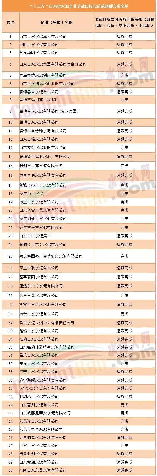 1月22日,根據(jù)《國家發(fā)展改革委辦公廳關于印發(fā)萬家企業(yè)節(jié)能目標責任考核實施方案的通知》(發(fā)改辦環(huán)資〔2012〕1923號)要求,山東省經(jīng)信委會同有關部門對全省1188家重點用能單位“十二五”節(jié)能目標完成情況和節(jié)能措施落實情況進行了考核,并將考核結(jié)果上報國家發(fā)展改革委。對超額完成和完成等次的單位予以通報表揚。值得慶幸的是,水泥行業(yè)沒有未完成等次的企業(yè)名單。有50家水泥企業(yè)完成或超額完成節(jié)能目標責任考核,其中,中建材、山水水泥、中聯(lián)水泥、海螺水泥等企業(yè)在列?,F(xiàn)公布如下: