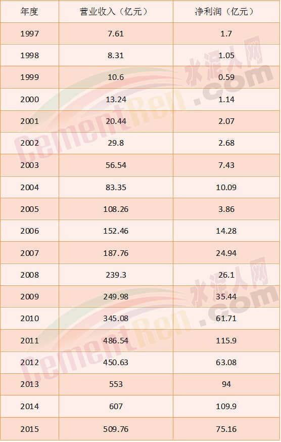 郭文叁時期(1997-2015年)海螺水泥營業(yè)收入與凈利潤表