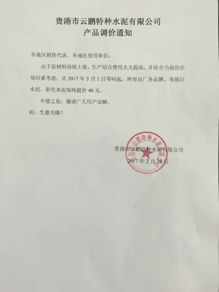 2月28日,貴港市云鵬特種水泥有限公司發(fā)布產(chǎn)品調(diào)價通知: