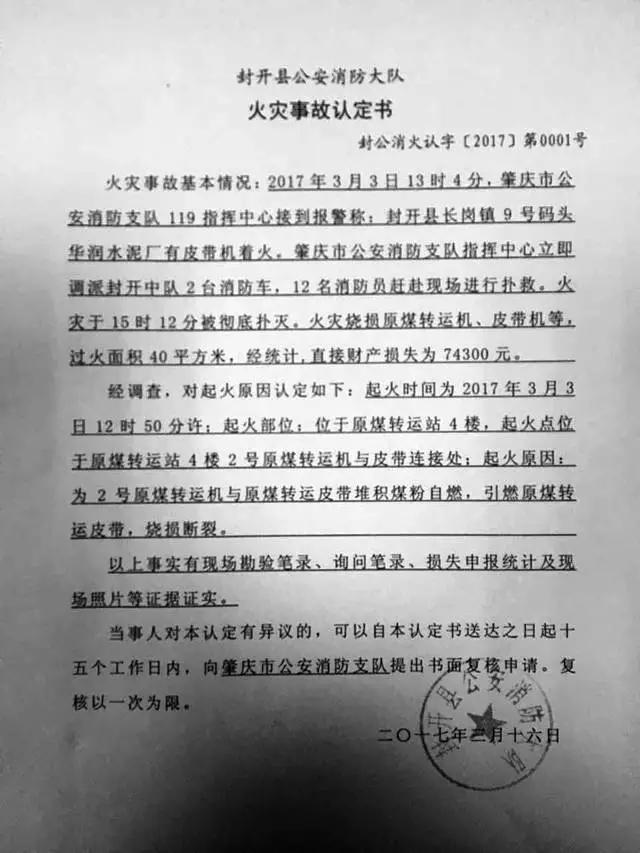 華潤(rùn)水泥(封開(kāi))有限公司所在地肇慶市封開(kāi)縣公安消防大隊(duì)已于昨日(3月16日)出具了火災(zāi)事故認(rèn)定書(shū)(封公消火認(rèn)字[2017]第0001號(hào))事故認(rèn)定書(shū)描述的起火原因?yàn)椋?號(hào)原煤轉(zhuǎn)運(yùn)機(jī)與原煤轉(zhuǎn)運(yùn)皮帶堆積煤粉自燃,引燃原煤轉(zhuǎn)運(yùn)皮帶,燒損斷裂?;馂?zāi)燒損原煤轉(zhuǎn)運(yùn)機(jī)、皮帶機(jī)等,過(guò)火面積40平方米,直接財(cái)產(chǎn)損失為74300元。
