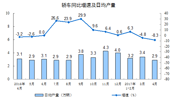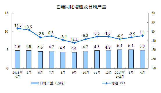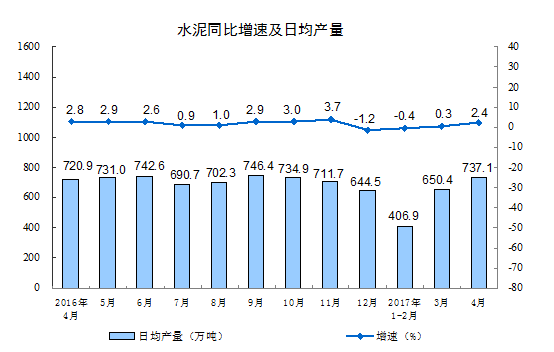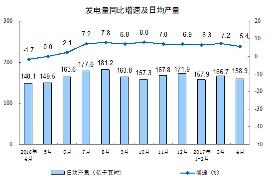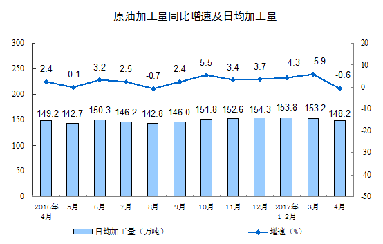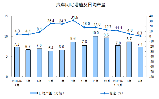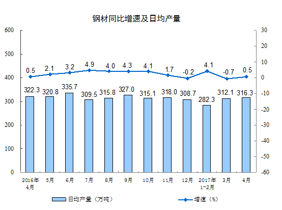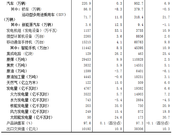 分產品看,4月份,596種產品中有419種產品同比增長。其中,鋼材9490萬噸,同比增長0.5%;水泥22113萬噸,增長 2.4%;十種有色金屬451萬噸,增長5.0%;乙烯150萬噸,增長1.1%;汽車220.9萬輛,增長0.3%;轎車86.0萬輛,下降8.3%;發(fā)電量4767億千瓦時,增長5.4%;原油加工量4445萬噸,下降0.6%。