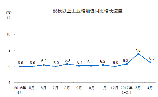 分行業(yè)看,4月份,41個大類行業(yè)中有36個行業(yè)增加值保持同比增長。其中,農副食品加工業(yè)增長8.5%,紡織業(yè)增長3.9%,化學原料和化學制品制造業(yè)增長3.9%,非金屬礦物制品業(yè)增長6.3%,黑色金屬冶煉和壓延加工業(yè)增長0.2%,有色金屬冶煉和壓延加工業(yè)增長1.4%,通用設備制造業(yè)增長10.8%,專用設備制造業(yè)增長12.0%,汽車制造業(yè)增長9.2%,鐵路、船舶、航空航天和其他運輸設備制造業(yè)增長7.3%,電氣機械和器材制造業(yè)增長9.1%,計算機、通信和其他電子設備制造業(yè)增長13.0%,電力、熱力生產和供應業(yè)增長7.8%。
