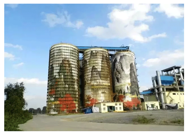 把國畫畫到水泥罐上,夠新鮮的了!這家水泥廠太有創(chuàng)意。據(jù)了解,這3個水泥罐高44米。國畫總面積4千多平米,這應(yīng)該是世界上最大的山水國畫了。每年都能吸引不少游客前來拍照!