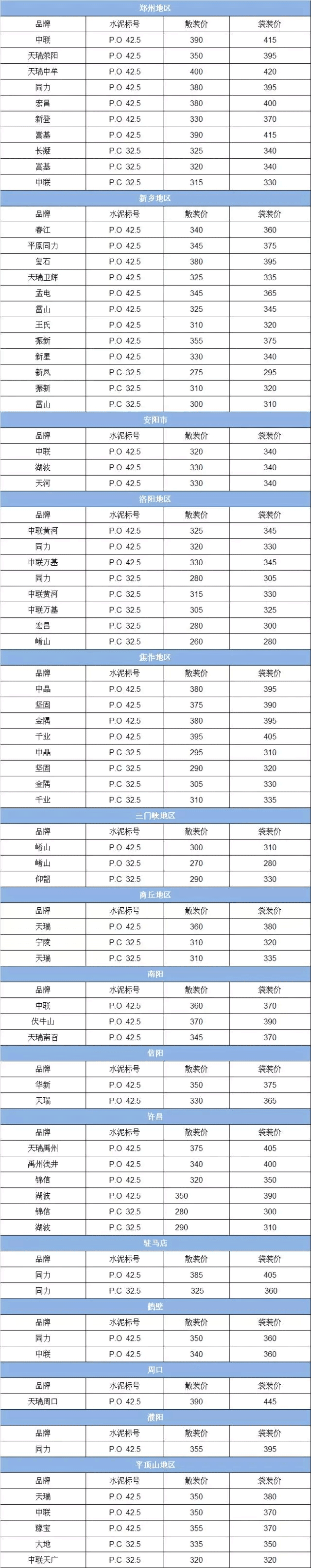 附: 河南省區(qū)域水泥市場近期價格一覽