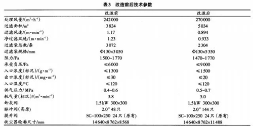 但我廠由于受場(chǎng)地限制,空間狹窄,無(wú)法采用第一種方案,只能采用第二種方案,即收塵器加高方案。改造后的技術(shù)參數(shù)見表3。