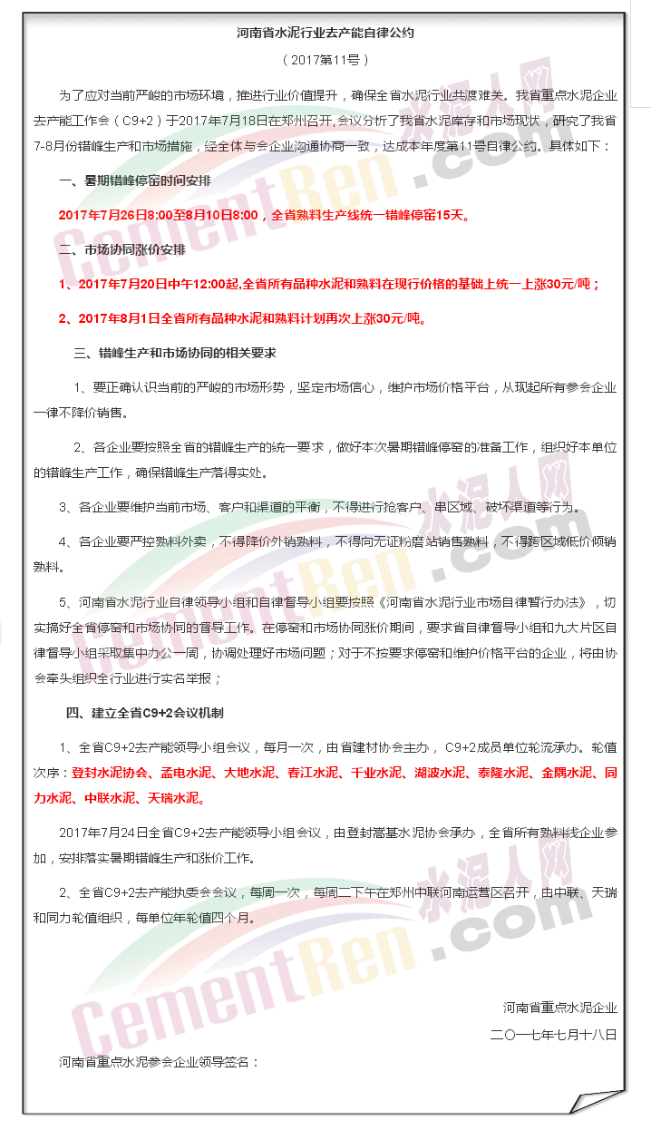 “自律公約”要求河南全省熟料生產(chǎn)線2017年7月26日8:00至8月10日8:00,統(tǒng)一錯(cuò)峰停窯15天;2017年7月20日中午12:00起,全省所有品種水泥和熟料在現(xiàn)行價(jià)格的基礎(chǔ)上統(tǒng)一上漲30元/噸;2017年8月1日全省所有品種水泥和熟料計(jì)劃再次上漲30元/噸。