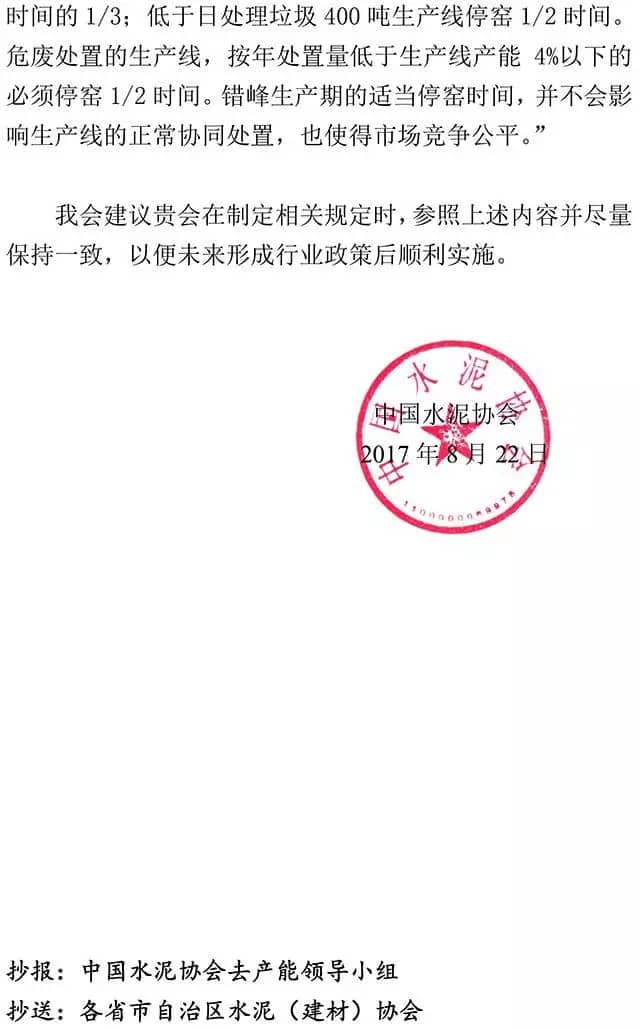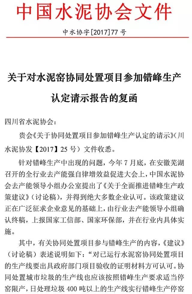 昨日(22日),中國水泥協(xié)會(huì)回復(fù)四川省水泥協(xié)會(huì)的公函中再一次明確,水泥窯協(xié)同處置生活垃圾和危險(xiǎn)廢物生產(chǎn)線遇錯(cuò)峰生產(chǎn)并不能“免疫”。一則需降低生產(chǎn)負(fù)荷,二則需按相應(yīng)產(chǎn)能適當(dāng)停窯限產(chǎn)。