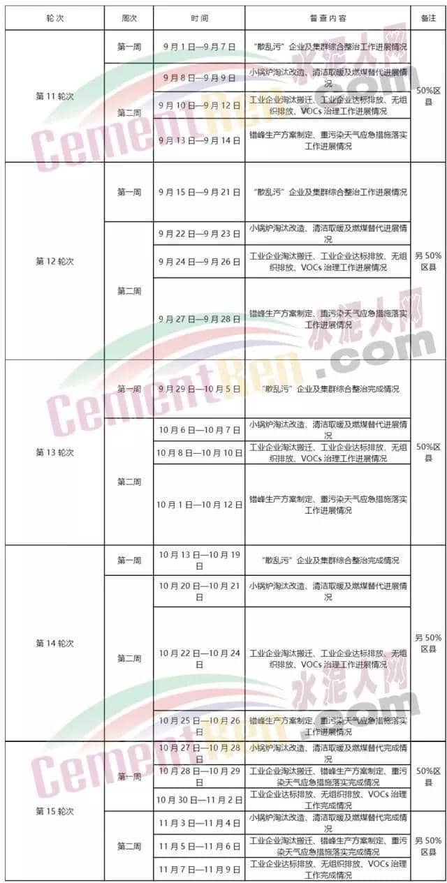 第一階段(2017 年 9 月 1 日至 11 月 9 日),共 5 個輪次(第 11至 15 輪次)70 天,重點對“2+26”城市所有縣(區(qū))全部 12 項任務完成情況、各項減排措施的落實情況、任務清單外的涉氣類突出問題以及《攻堅方案》中“2+26”城市的其他大氣污染綜合治理任務進行督查(具體安排見附 2)。