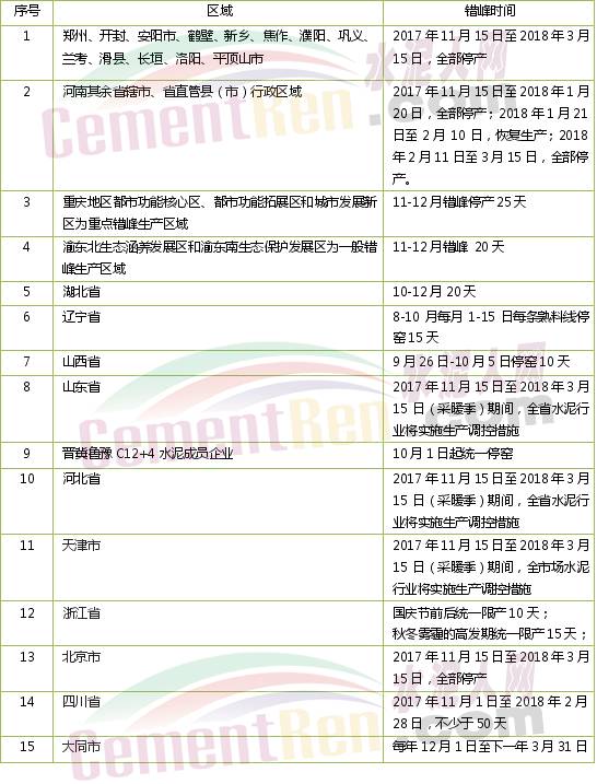 重慶市水泥企業(yè)錯峰時間安排