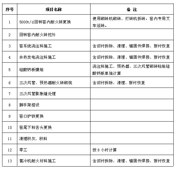 一、投標(biāo)內(nèi)容:窯耐火材料檢修,具體項(xiàng)目如下: