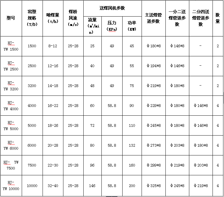 HJ窯尾強(qiáng)旋流燃燒器采用旋流擴(kuò)散型單通道燃燒器,采用了高氣固比低風(fēng)量、強(qiáng)旋流、煤粉濃縮等技術(shù),由高溫三次風(fēng)的迅速卷入大大縮短了煤粉預(yù)熱時(shí)間,提高和改善了火焰根部的環(huán)境和溫度,使煤粉在燃燒器出口就能迅速燃燒,有效提高煤粉燃盡率及物料分解效率,穩(wěn)定分解爐內(nèi)的熱工工藝。HJ窯尾強(qiáng)旋流燃燒器主要技術(shù)參數(shù)表如下: