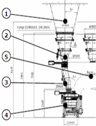 靠一套通氣系統(tǒng)(2)支持,煤粉從煤粉倉(cāng)(1)流出,轉(zhuǎn)子秤(4)將煤粉進(jìn)行定量喂料,傳送空氣(5)從風(fēng)機(jī)中出來(lái),并將煤粉直接吹到燃燒器。轉(zhuǎn)子秤喂料的高精度確保燃燒器中穩(wěn)定的空氣/煤粉混合。使用一個(gè)下料管(3)將煤粉倉(cāng)出口與轉(zhuǎn)子秤(4)相連。