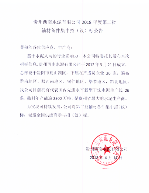 貴州西南水泥有限公司是西南水泥有限公司下屬子公司,于2012年3月21日成立。貴州西南水?dāng)M定于2018年5月中旬對(duì)下屬26家成員企業(yè)2018年度輔材備件進(jìn)行集中招標(biāo),通過(guò)邀請(qǐng)招標(biāo)(議價(jià))選擇資質(zhì)合格、保供能力強(qiáng)、質(zhì)量及技術(shù)服務(wù)均受控的供貨單位。現(xiàn)將相關(guān)招標(biāo)采購(gòu)信息發(fā)布如下: