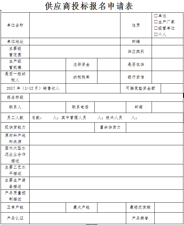 附件:貴州西南水泥2018年度輔材備件集中招(議)標(biāo)公告(供應(yīng)商投標(biāo)報(bào)名申請(qǐng)表)