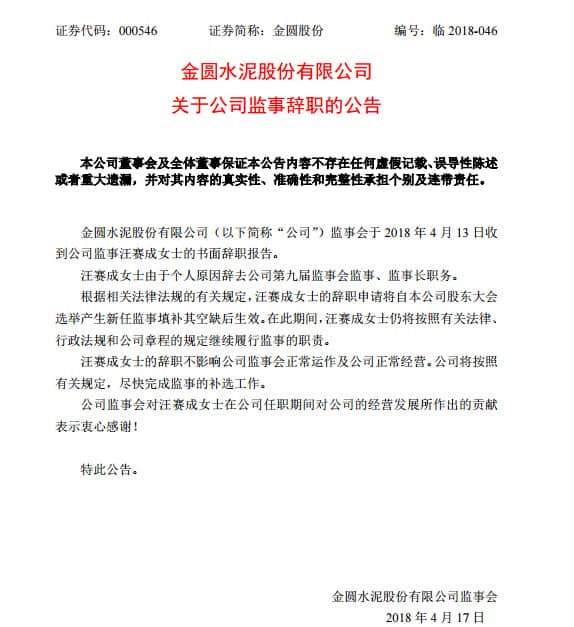 金圓水泥股份有限公司發(fā)布公告稱,監(jiān)事會于2018年4月13日收到公司監(jiān)事汪賽成女士的書面辭職報告。