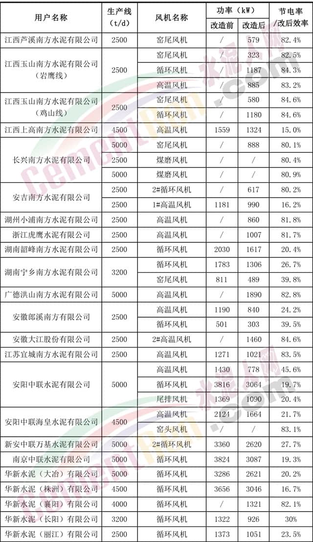 上海瑞晨水泥行業(yè)風機節(jié)能改造業(yè)績(部分)