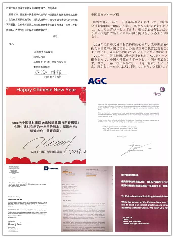 中國建材集團海外合作伙伴寄語集團2019年發(fā)展,其中既有擁有幾十年合作歷史的老朋友,也有在2018年結(jié)識的新朋友;既有基石業(yè)務(wù)持續(xù)推進中的支持者,也有三新產(chǎn)業(yè)開拓征途上的同行者。寄語中包含了對以往合作業(yè)績上的總結(jié)和感恩,也有對未來深入合作的思考和期待。