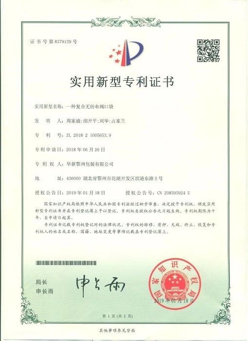 近日,華新包裝公司研制的“一種復合無紡布閥口袋”獲得了國家知識產(chǎn)權(quán)局頒發(fā)的實用新型專利證書,專利期限為10年,這是該公司獲得的第十項專利。