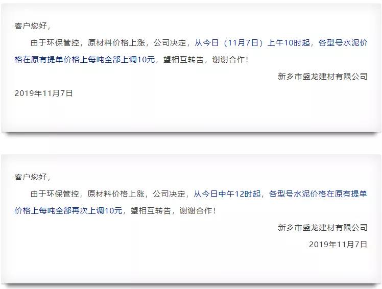 11月7日新鄉(xiāng)市盛龍建材有限公司一日內(nèi)兩次發(fā)布調(diào)價(jià)通知,共上調(diào)20元/噸。自此拉開了河南區(qū)域本月連漲的序幕。