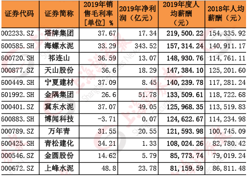 以海螺水泥為例,2019年凈利潤超過340億元,銷售毛利率超過33%。水漲船高,海螺水泥高管的薪水去年也普遍上調(diào)20萬元-30萬元不等,年薪大都超過了150萬元。