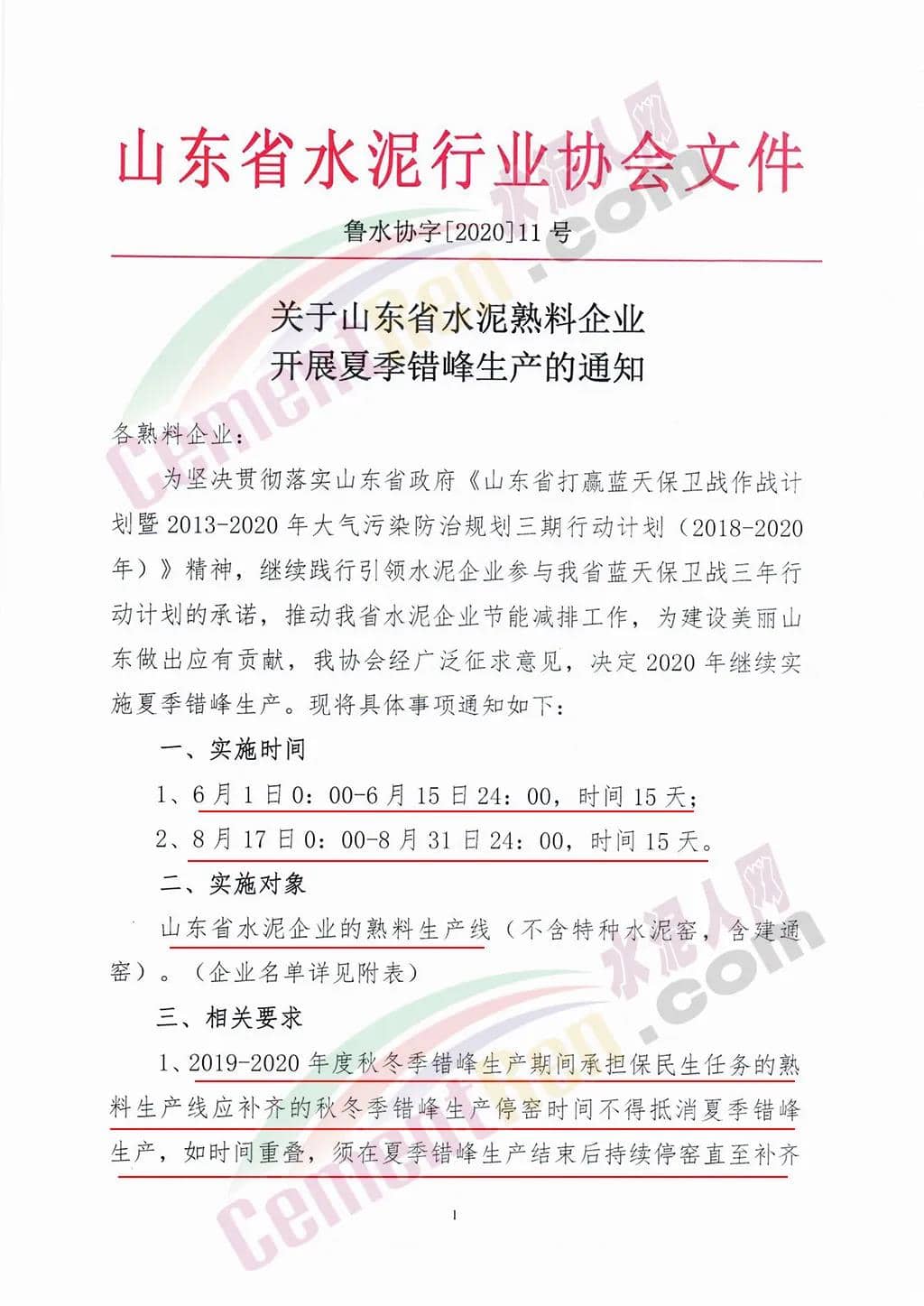 2019-2020年度秋冬季錯(cuò)峰生產(chǎn)期間承擔(dān)保民生任務(wù)的熟料生產(chǎn)線應(yīng)補(bǔ)齊秋冬季錯(cuò)峰停窯時(shí)間不得抵消夏季錯(cuò)峰生產(chǎn),如時(shí)間重疊,須在夏季錯(cuò)峰生產(chǎn)結(jié)束后持續(xù)停窯直至補(bǔ)齊秋冬季錯(cuò)峰生產(chǎn)停窯時(shí)間。