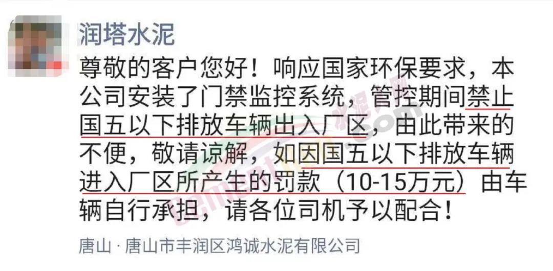 唐山市豐潤區(qū)鴻誠水泥有限公司(潤塔牌水泥)通知稱,公司安裝了門禁監(jiān)控系統(tǒng),管控期間禁止國五以下排放車輛出入廠區(qū)。如因國五以下排放車輛進入廠區(qū)所產(chǎn)生的罰款(10-15萬元)由車輛自行承擔。