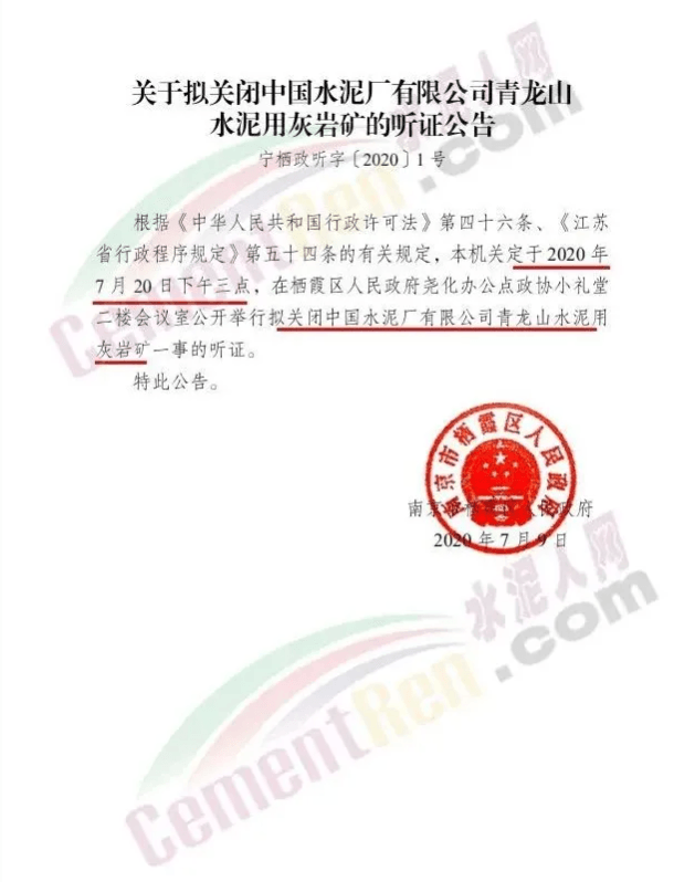 在蘇北淮海中聯(lián)水泥退出一事懸而未決之時(shí),南京市棲霞區(qū)政府的這兩則聽(tīng)證會(huì)公告,更加重了當(dāng)?shù)?a href="http://m.lcgyank.cn/news/list_1.html" target="_blank" class="keylink">水泥行業(yè)的緊張情緒。據(jù)水泥人網(wǎng)了解,2019年7月8日和10月15日淮海中聯(lián)水泥所屬焦山礦區(qū)和青龍山礦區(qū)開(kāi)采許可證分別到期,骨料、熟料及粉磨生產(chǎn)線相繼停產(chǎn)。當(dāng)?shù)卣丛倮m(xù)批礦山許可。淮海中聯(lián)水泥一直外購(gòu)礦石用于生產(chǎn)。