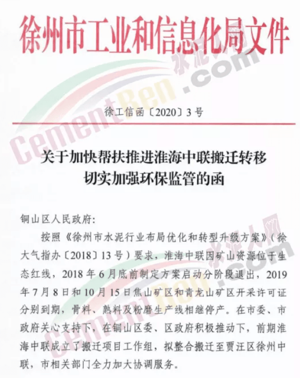 今年3月份,徐州市工信局為了進(jìn)一步敦促淮海中聯(lián)水泥盡快退出,發(fā)布了《關(guān)于加快幫扶推薦淮海中聯(lián)搬遷轉(zhuǎn)移切實(shí)加強(qiáng)環(huán)保監(jiān)管的函》稱(chēng),要求相關(guān)部門(mén)嚴(yán)肅屬地監(jiān)管責(zé)任,組織有關(guān)部門(mén)立即調(diào)查,嚴(yán)防礦山資源非法啟動(dòng)開(kāi)采,加大污染物在線監(jiān)測(cè)和環(huán)境執(zhí)法力度,切實(shí)加強(qiáng)區(qū)域道路運(yùn)輸監(jiān)管,杜絕外購(gòu)礦石、擅自復(fù)產(chǎn)等現(xiàn)象。