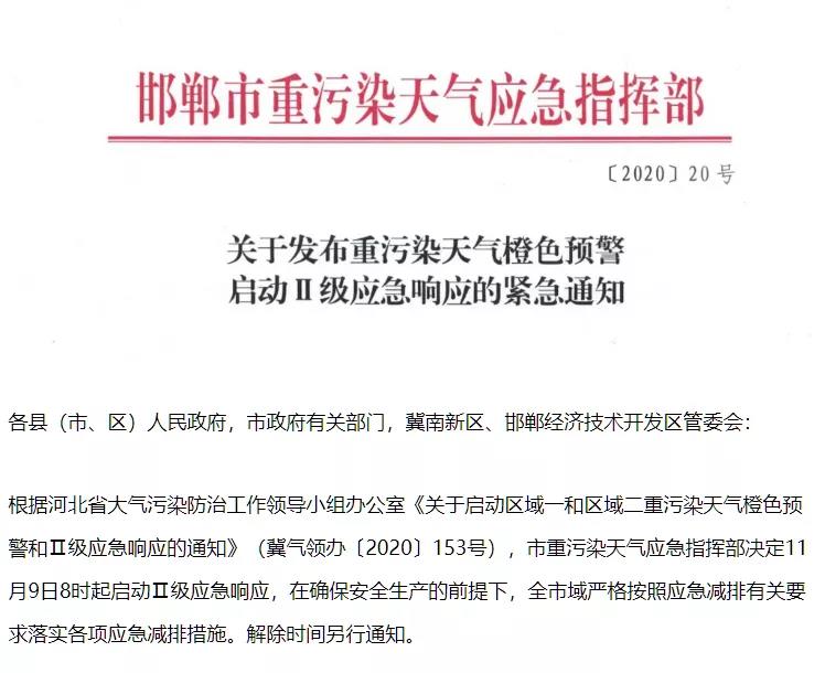 邯鄲市重污染天氣應急指揮部通知,于11月9日8時起啟動Ⅱ級應急響應,在確保安全生產(chǎn)的前提下,全市域嚴格按照應急減排有關要求落實各項應急減排措施。工業(yè)企業(yè)合理調(diào)控生產(chǎn)計劃,在確保安全生產(chǎn)和民生保障的前提下,按照《邯鄲市2020-2021年重污染天氣應急減排工業(yè)源清單(修訂版)》橙色預警(Ⅱ級)差異化減排措施執(zhí)行到位。