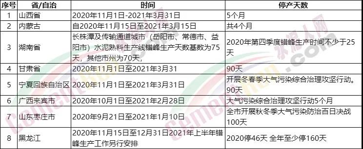 8個(gè)地區(qū)發(fā)布水泥行業(yè)錯(cuò)峰生產(chǎn)計(jì)劃 最長(zhǎng)停產(chǎn)160天