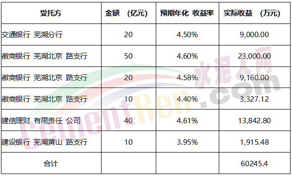 據(jù)水泥人網(wǎng)了解,海螺水泥有大量的現(xiàn)金流,這也是海螺水泥敢于四處擴(kuò)建的最大優(yōu)勢(shì),根據(jù)海螺水泥2020年中報(bào)數(shù)據(jù)顯示,通過理財(cái)海螺水泥的實(shí)際益就達(dá)到6億元,這是很多水泥企業(yè)辛苦一年的收益。海螺水泥2020年部分理財(cái)收益如表1所示: