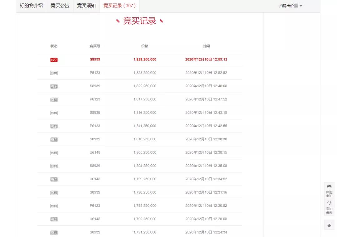 截至上午9點半,競拍價還停留在8.95億元,1分鐘后,Y5133號競買人率先加價1百萬元打破了僵局,隨后U6148、S8939號也開始試探性地逐步加價,當(dāng)Y5133號加價至9億元時,S8939號再也按捺不住沖天的豪氣,直接加價1億元,競拍價一下子突破10億元大關(guān)!