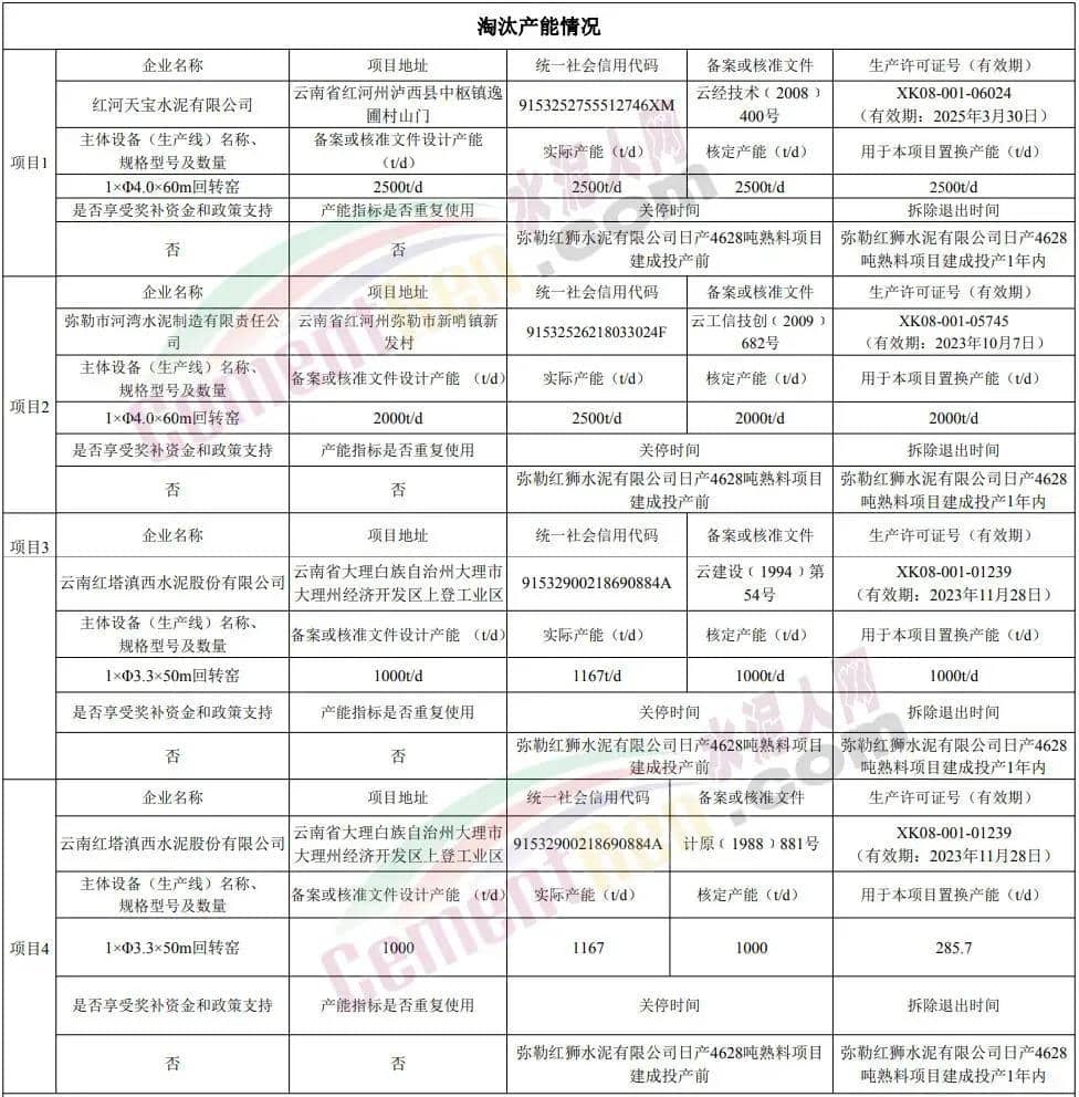 日前,云南省工業(yè)和信息化廳發(fā)布《彌勒紅獅水泥有限公司日產(chǎn)4628噸熟料建設(shè)項(xiàng)目產(chǎn)能置換方案公示》稱將通過(guò)1:1.25置換比例退出四條生產(chǎn)線合計(jì)5785.7t/d產(chǎn)能在云南省紅河哈尼族彝族自治州彌勒市境內(nèi)新建一條日產(chǎn)4628噸熟料生產(chǎn)線(1×Φ4.72×78m回轉(zhuǎn)窯),計(jì)劃投產(chǎn)時(shí)間:2023年12月。