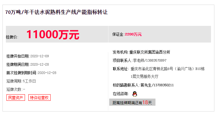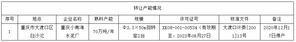 同期,重慶市產(chǎn)權(quán)交易網(wǎng)掛出小南海水泥廠70萬噸/年干法水泥熟料生產(chǎn)線產(chǎn)能指標轉(zhuǎn)讓的消息。