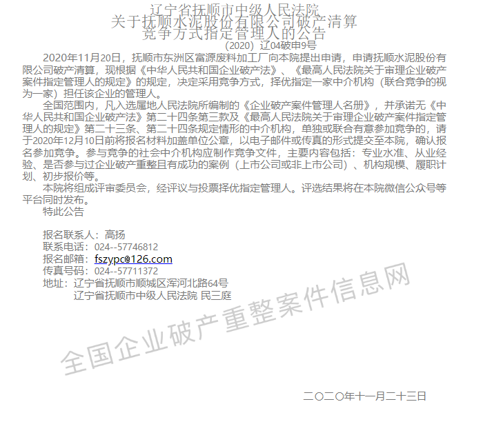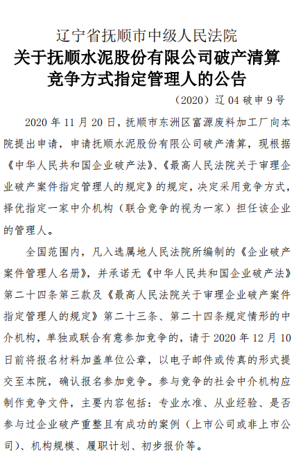 一、遼寧撫順水泥股份有限公司存產(chǎn)清算競爭方式指定管理人
