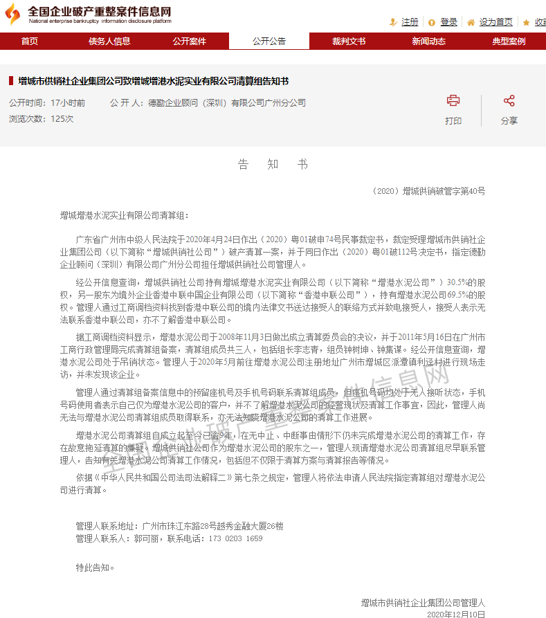 二、增城市供銷社企業(yè)集團公司致增城增港水泥實業(yè)有限公司清算組告知書