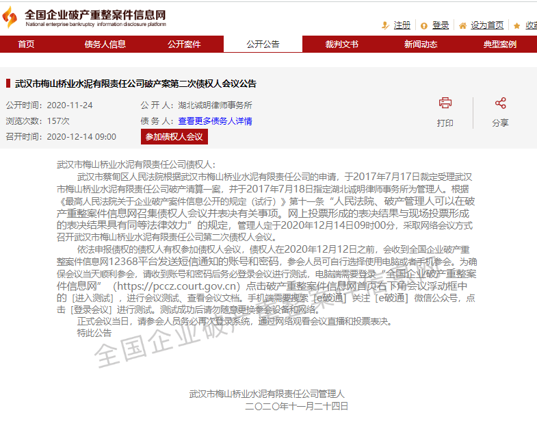 三、武漢市梅山橋業(yè)水泥有限責任公司破產(chǎn)案第二次債權(quán)人會議