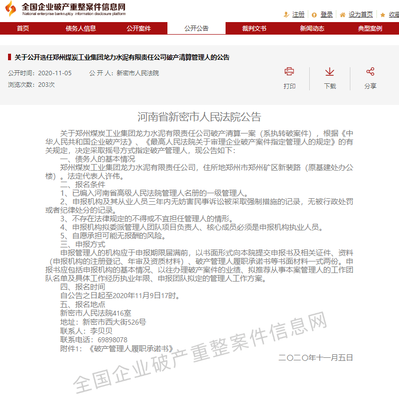 四、關(guān)于公開選任鄭州煤炭工業(yè)集團龍力水泥有限責任公司破產(chǎn)清算管理人