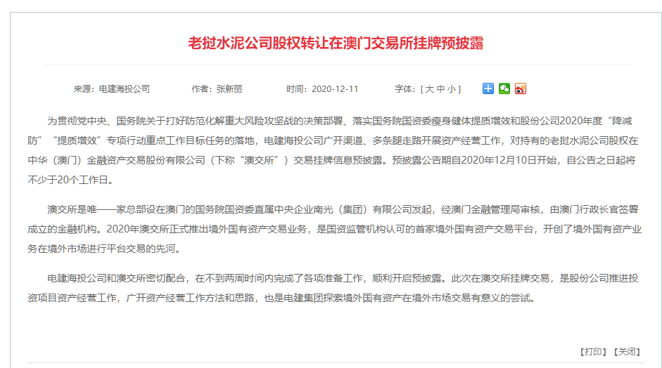 日前,中國電建官網(wǎng)發(fā)布消息稱,為防范化解重大風險攻堅戰(zhàn)的決策部署、落實瘦身健體提質(zhì)增效和股份公司2020年度“降減防”“提質(zhì)增效”專項行動重點工作目標任務(wù)的落地,電建海投公司廣開渠道、多條腿走路開展資產(chǎn)經(jīng)營工作,對持有的老撾水泥公司股權(quán)在中華(澳門)金融資產(chǎn)交易股份有限公司(下稱“澳交所”)交易掛牌信息預披露。預披露公告期自2020年12月10日開始,自公告之日起將不少于20個工作日。澳交所是唯一一家總部設(shè)在澳門的國務(wù)院國資委直屬中央企業(yè)南光(集團)有限公司發(fā)起,經(jīng)澳門金融管理局審核,由澳門行政長官簽署成立的金融機構(gòu)。2020年澳交所正式推出境外國有資產(chǎn)交易業(yè)務(wù),是國資監(jiān)管機構(gòu)認可的首家境外國有資產(chǎn)交易平臺,開創(chuàng)了境外國有資產(chǎn)業(yè)務(wù)在境外市場進行平臺交易的先河。
