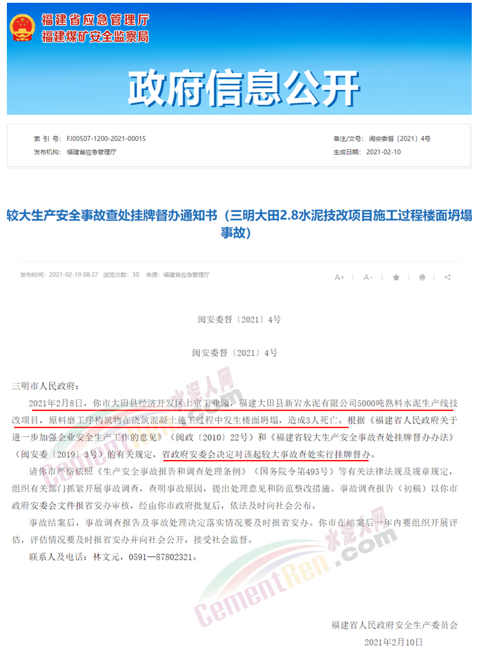 據(jù)水泥人網(wǎng)了解,福建省應(yīng)急管理廳發(fā)布較大生產(chǎn)安全事故查處掛牌督辦通知書(shū)(三明大田2.8水泥技改項(xiàng)目施工過(guò)程樓面坍塌事故)稱,2021年2月8日,三明市大田縣經(jīng)濟(jì)開(kāi)發(fā)區(qū)上京工業(yè)園,福建大田縣新巖水泥有限公司5000噸熟料水泥生產(chǎn)線技改項(xiàng)目,原料磨工序構(gòu)筑物在澆筑混凝土施工過(guò)程中發(fā)生樓面坍塌,造成3人死亡。 依據(jù)有關(guān)規(guī)定,福建省政府安委會(huì)決定對(duì)該起較大事故查處實(shí)行掛牌督辦。