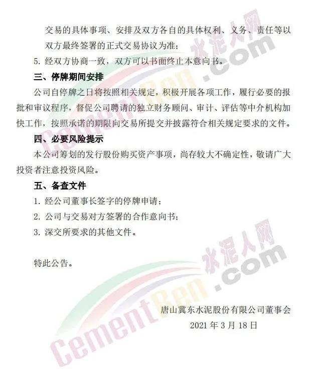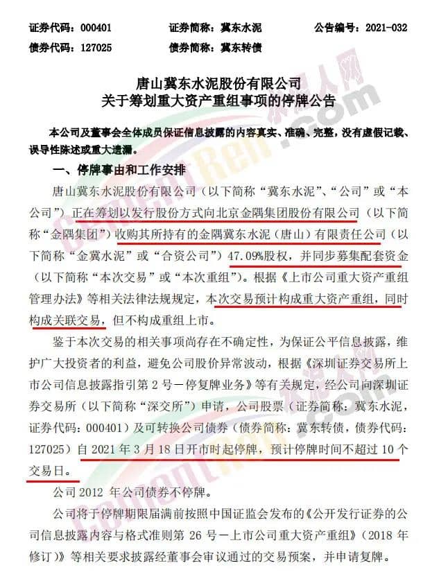 冀東水泥(000401)3月17日晚間公告,公司正在籌劃以發(fā)行股份方式向北京金隅集團股份有限公司收購其所持有的金隅冀東水泥(唐山)有限責任公司47.09%股權,并同步募集配套資金。