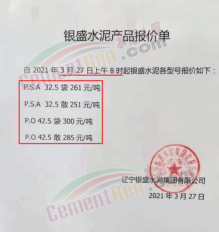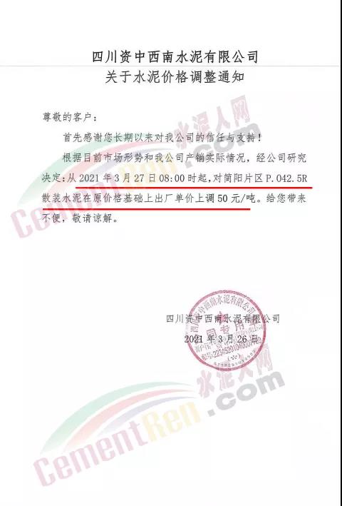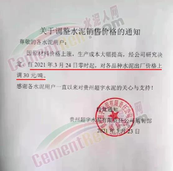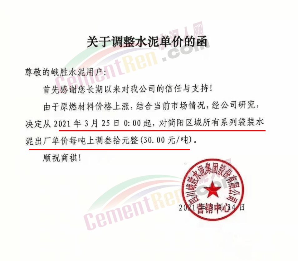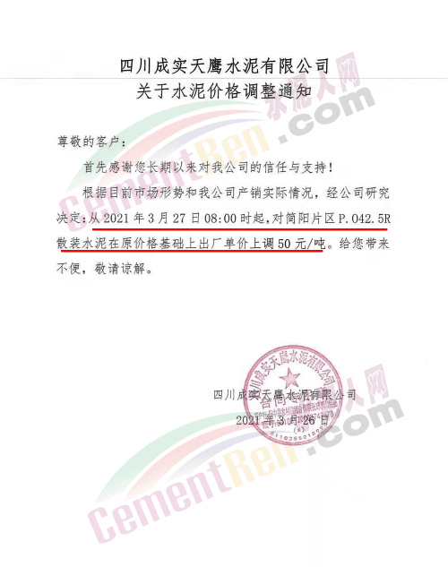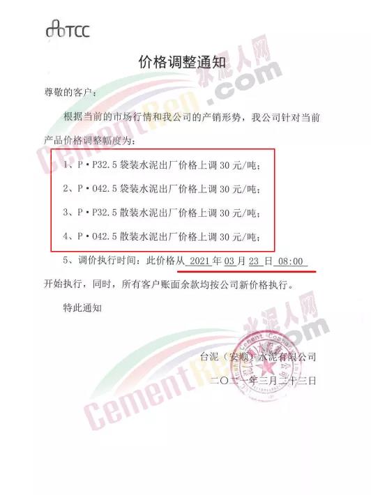 根據(jù)當前市場行情,我公司于2021年3月26日8:00時,對M32.5級袋裝水泥上調(diào)20元/噸,對PO42.5級袋裝水泥價格上調(diào)30元/噸,特此通知!