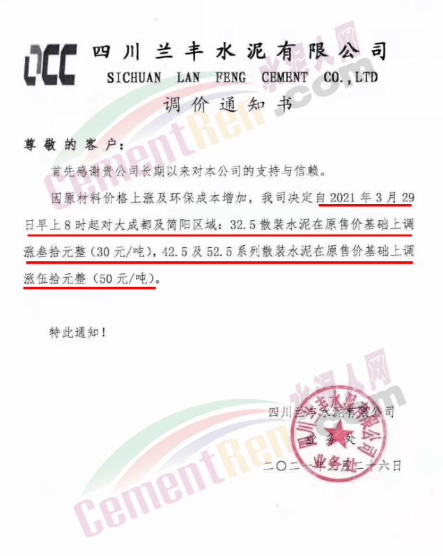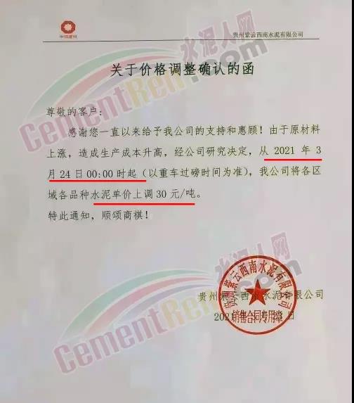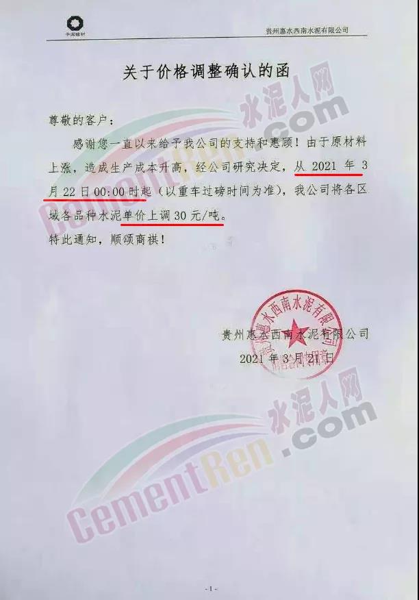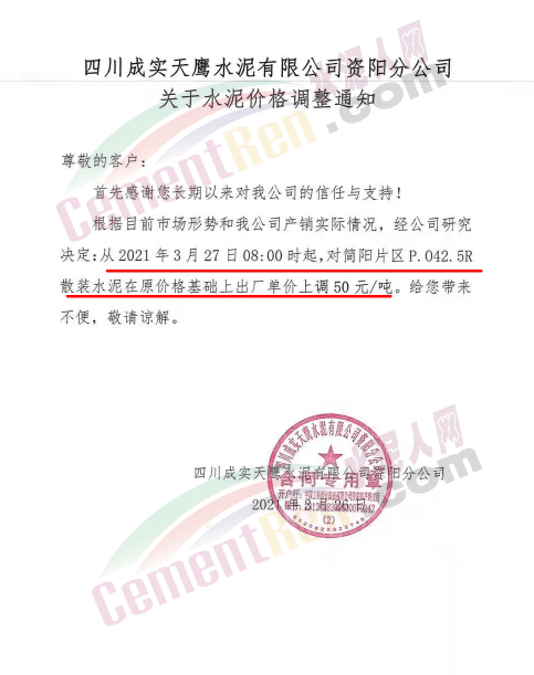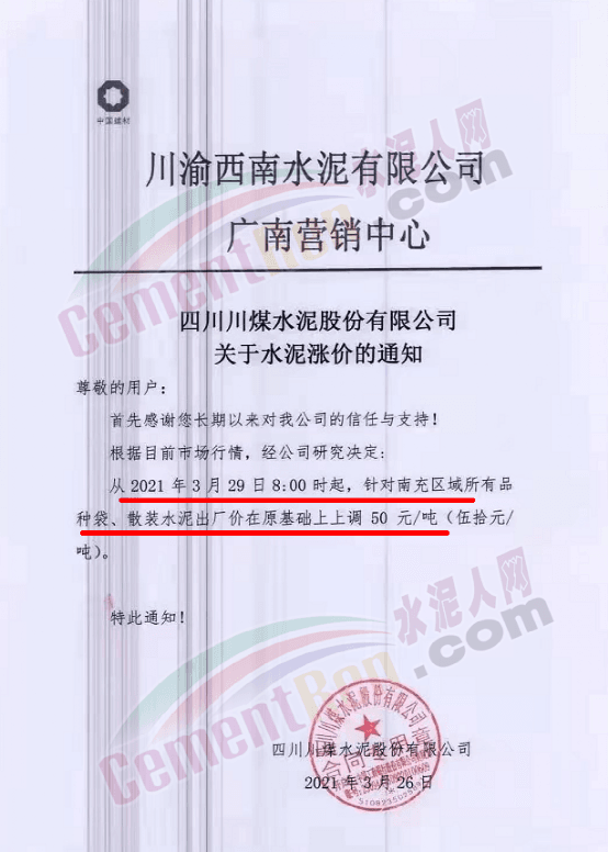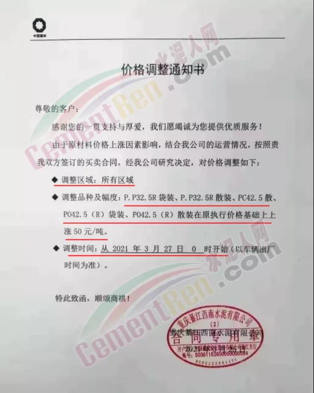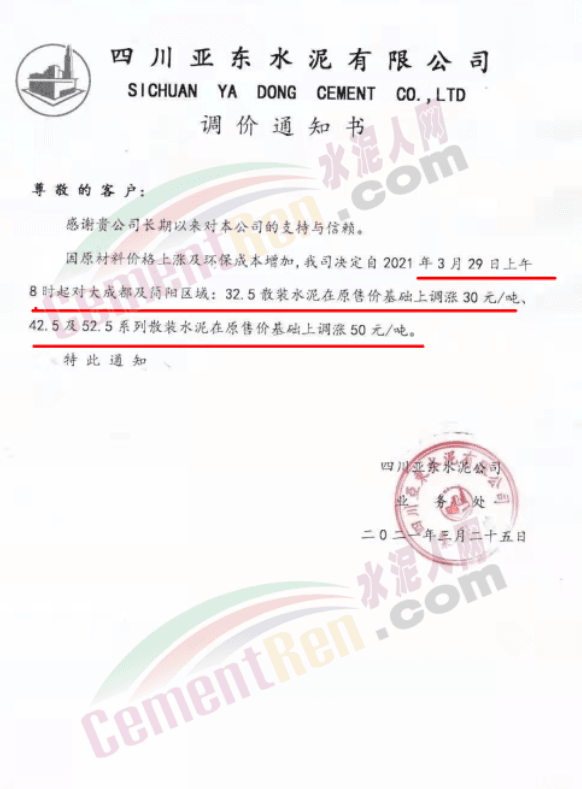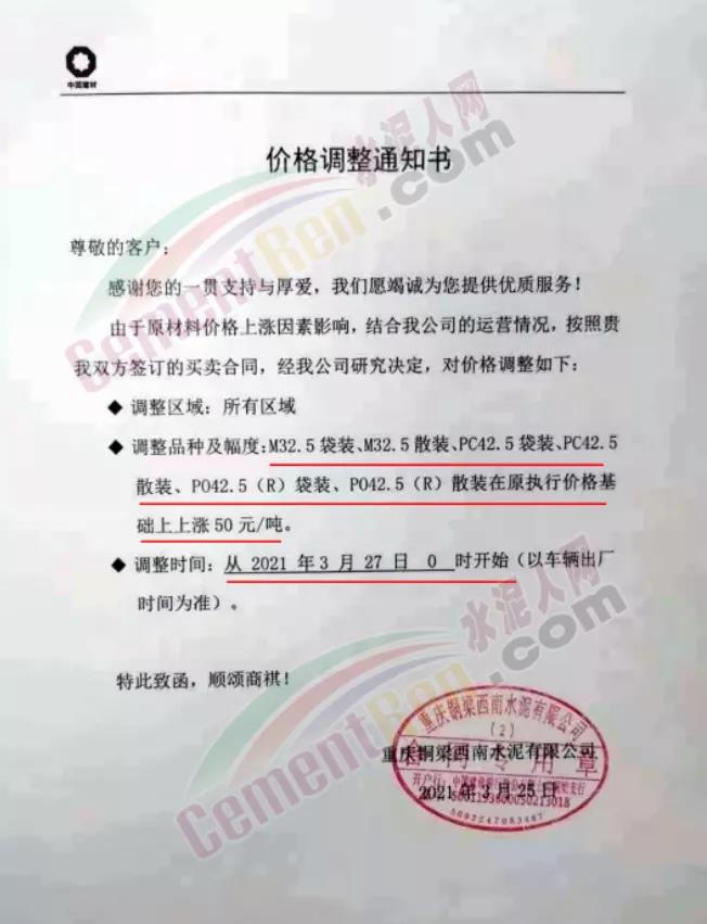 您好!感謝您對我司長期的信賴和支持,根據(jù)近期市場形勢,我司決定于2021年3月25日00:00起,對所有品種袋裝水泥價格上調(diào)20元/噸、散裝水泥價格上調(diào)20元/噸。