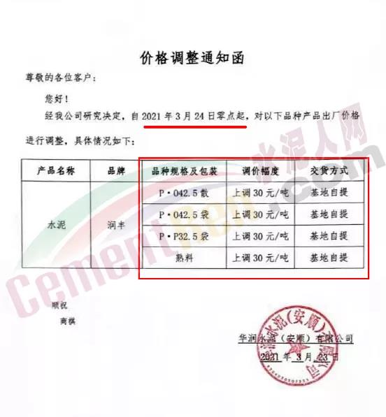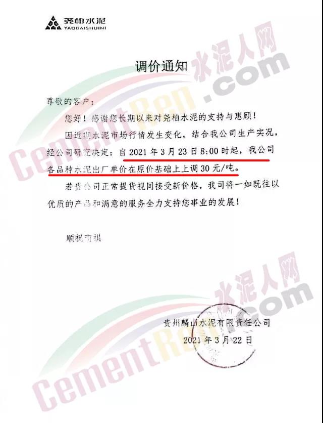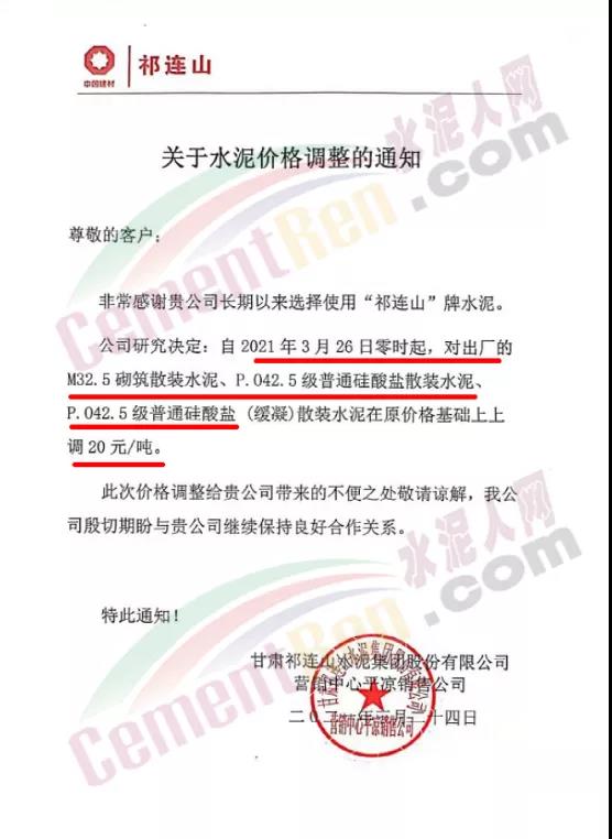 根據(jù)近期市場形勢,我司決定于2021年3月25日00:00起,全品項袋裝和散裝水泥價格上調(diào)20元/噸。