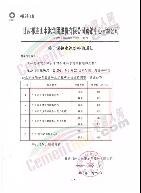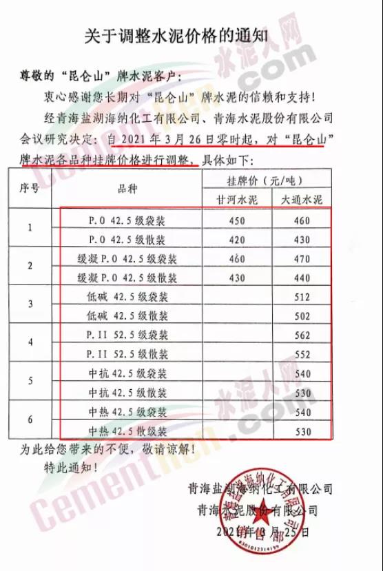 青海鹽湖海納化工有限公司青海水泥股份有限公司通知自3月26日零時起,對“昆侖山”牌水泥各品種掛牌價格進行調(diào)整,調(diào)整后PO42.5散裝水泥甘河水泥報價420元/噸,大通水泥報價430元/噸。
