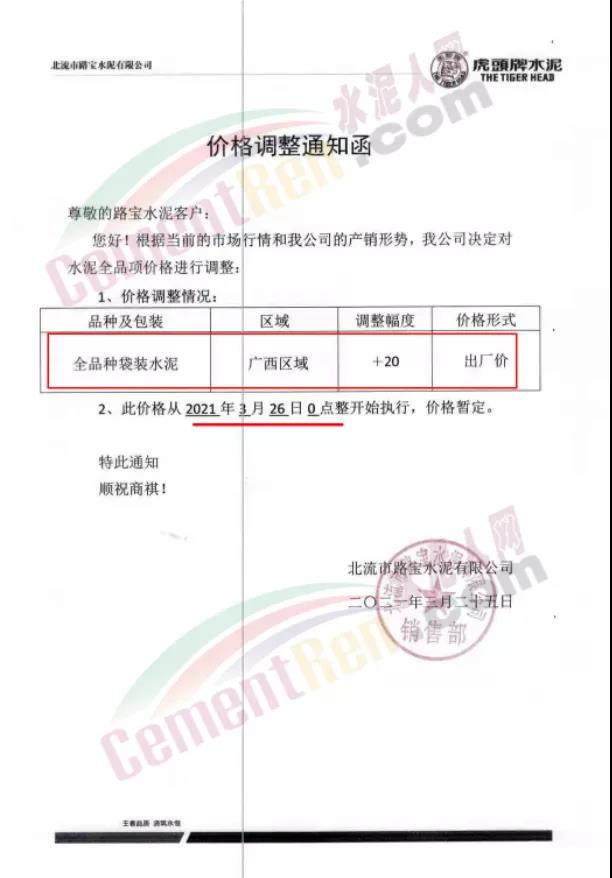 同期,廣西壯族自治區(qū)華潤、臺泥、路寶水泥等品牌企業(yè)通知自25日起各品種水泥價格上調(diào)20元/噸。