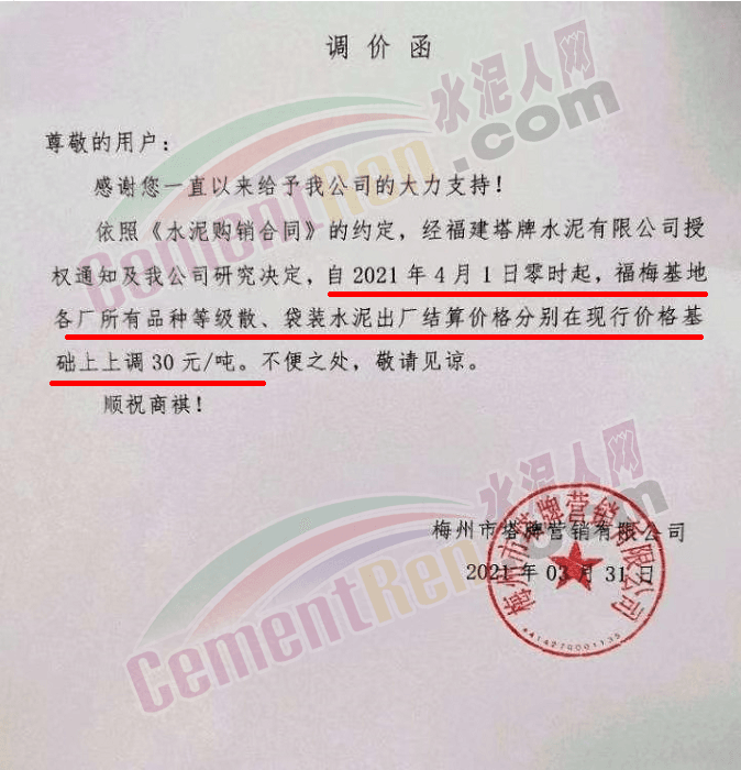 梅州市塔牌營銷有限公司通知,自4月1日零時起,福梅基地各廠所有品種等級散、袋裝泥出廠結(jié)算價上調(diào)30元/噸。